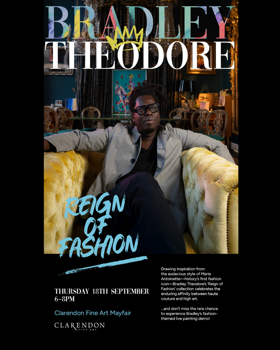 This September, Caribbean-born artist Bradley Theodore returns to Clarendon Fine Art Mayfair with a bold new body of work inspired by one of history’s most divisive figures: the rebellious and extravagant Marie Antoinette.